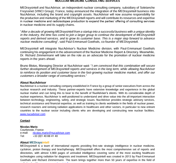 MEDraysintell acquired by NucAdvisor NucAdvisor is proud to announce the acquisition of MEDraysintell a brand with international experts providing first-rate strategic intelligence in nuclear medicine, radiopharmaceutical, cyclotron, proton therapy and brachytherapy. MEDraysintell was created in 2013 by